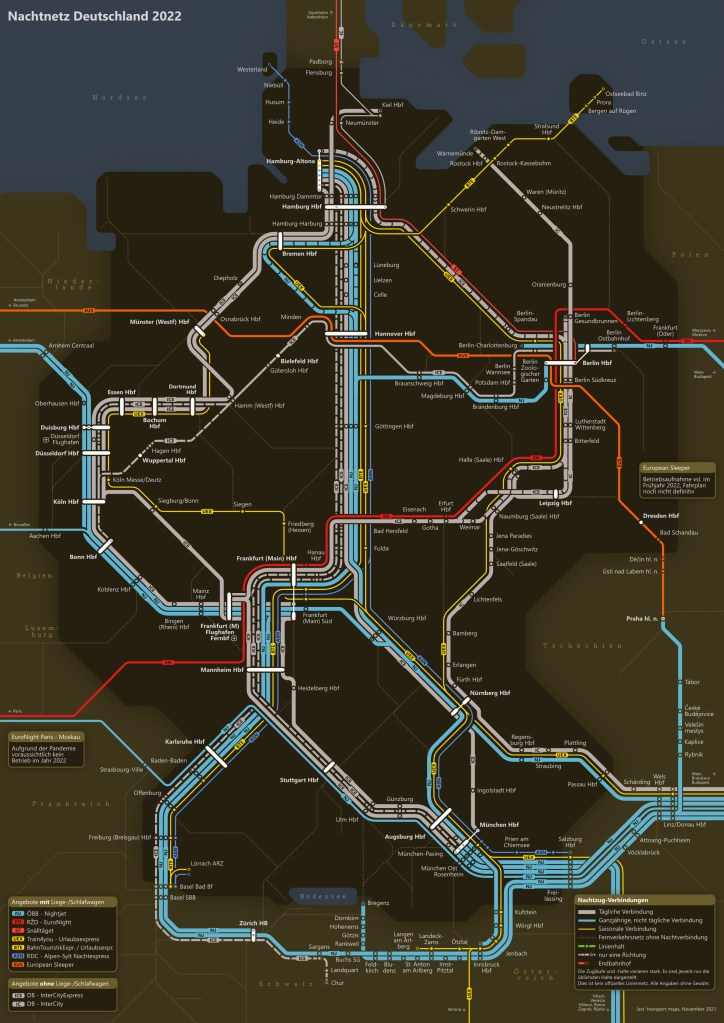 Again, I have updated the map showing the long-distance night trains in Germany for the year 2022. You can find the older versions on my blog.
