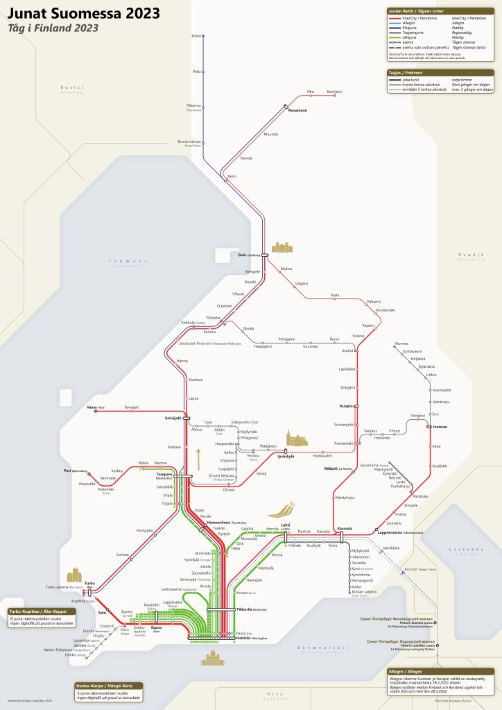 Kleine Anmerkung: Die Linie Helsinki–Turku endet bis auf Weiteres bereits am Bahnhof Kupittaa, der Zugverkehr zum Bahnhof Turku ist wegen mehrjärhiger Bauarbeiten unterbrochen.
