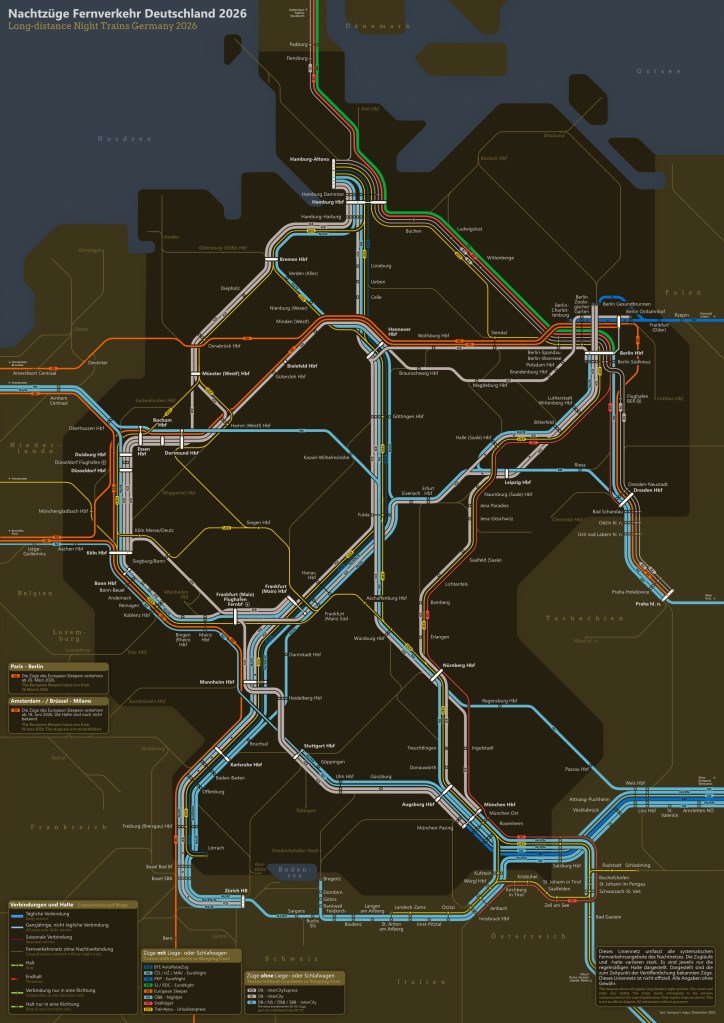 The long-distance Night Train Diagram 2025 has undergone some changes in the 2026 update. Services on the NightJet to Paris and Berlin-Brussels have been cancelled. By contrast, European Sleeper is introducing a new train from Paris and Brussels to Berlin in March. In June, they will introduce a train from Amsterdam and Brussels to Milan. RDC will continue operating the night train from Stockholm to Hamburg and Berlin, even without support from Trafikverket, the Swedish transport authority.