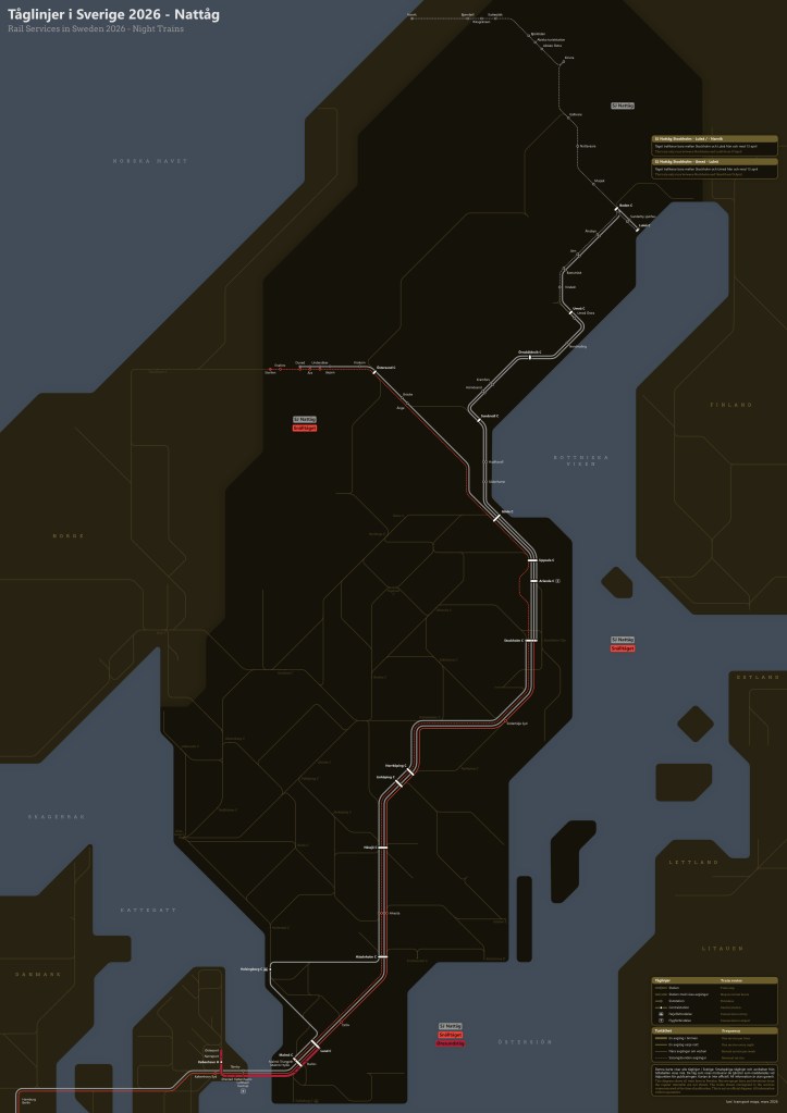 The Sweden Night Train Diagram 2025 has got an update. Unfortunately, the diagram has become emptier. There are fewer seasonal services to Östersund-Duved. Starting in April, the group of wagons to Kiruna and Narvik will be discontinued. The existing night train from Stockholm to Luleå will only run as far as Umeå.