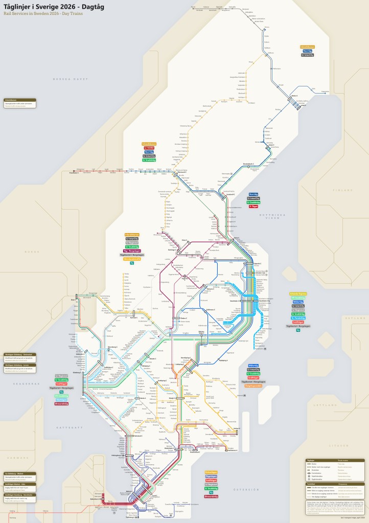 Compared to the 2025 version, there have been some changes in the long-distance traffic. Snälltåget has introduced a new service running along the west coast from Malmö to Oslo. There is also a Snälltåget service from Stockholm to Hamburg. In 2025, Vy introduced direct trains from Oslo to Stockholm via Örebro. The Pågatågen lines have been reorganised around Malmö. Disruptions and diversions around Gothenburg are ongoing.